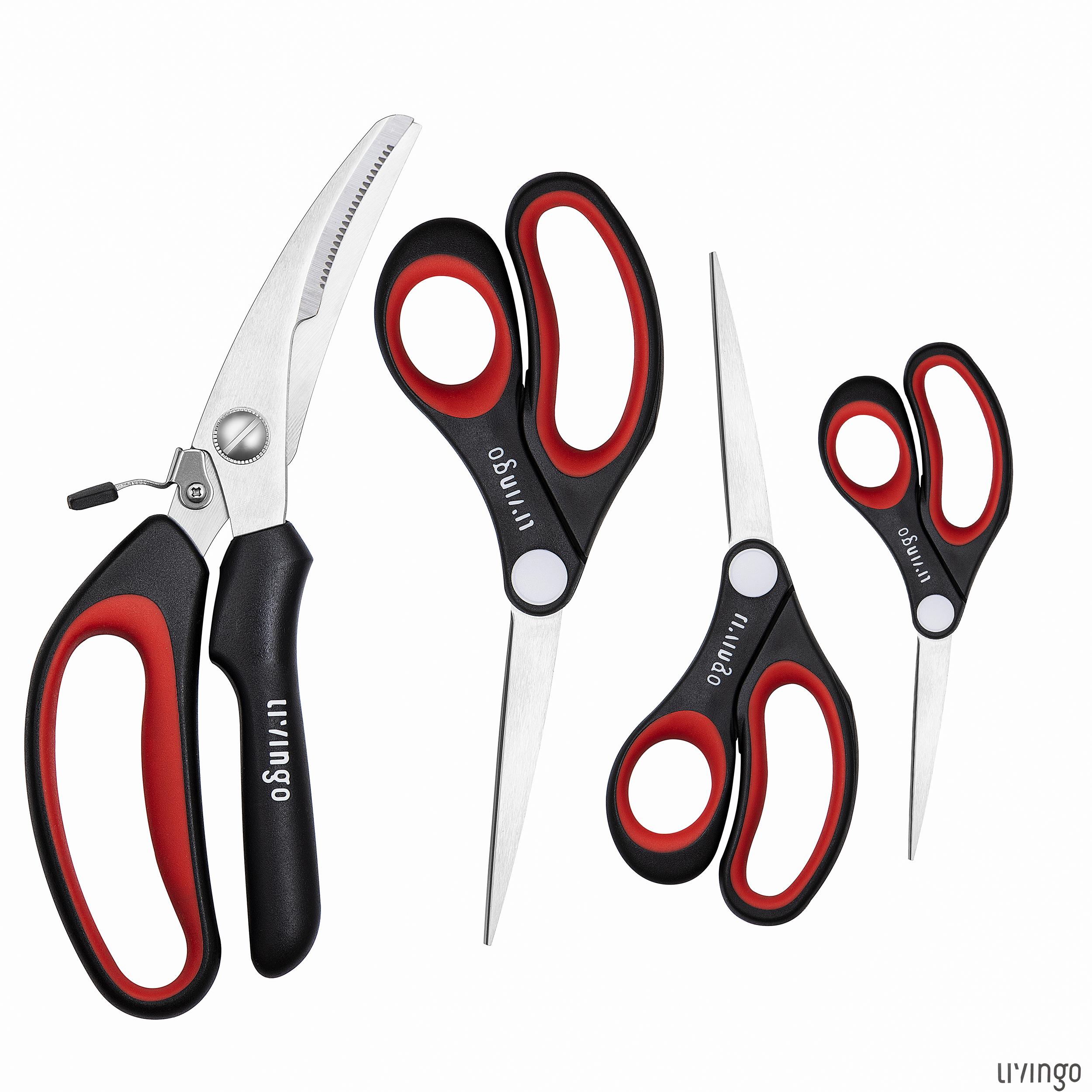 This versatile 4-piece scissors set includes three general-use scissors in 7.5-inch, 8-inch, and 10-inch sizes, plus a 10-inch spring-action kitchen scissor. Built with durable stainless steel blades, these scissors handle everyday tasks from cutting paper to preparing food. Comfortable handles and strong blades make them ideal for home, office, and kitchen use.